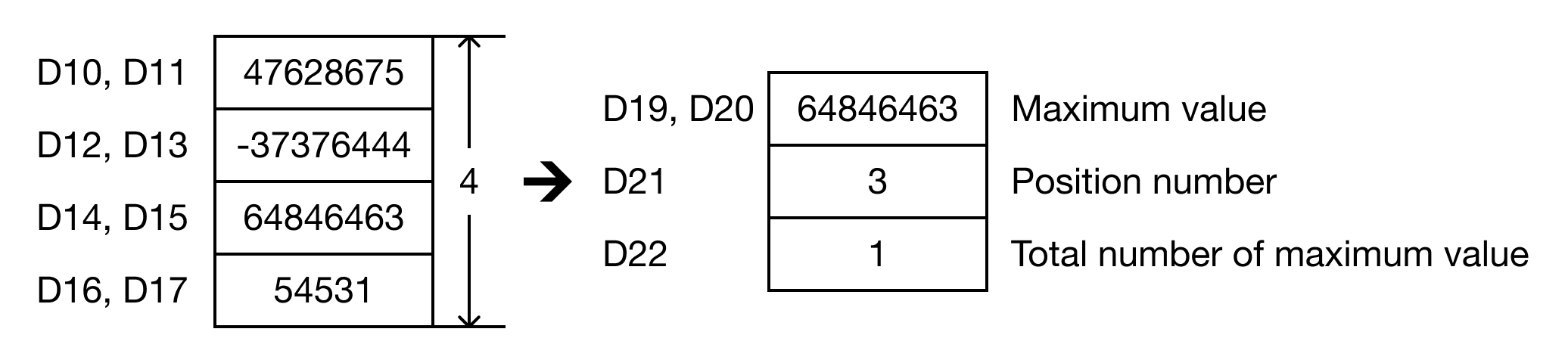 The DMAXP one-shot instruction searches n number of DWORD data registers, starting at S, for the maximum possible value. The result of the search is saved in 4 assigned WORD data registers starting at D.