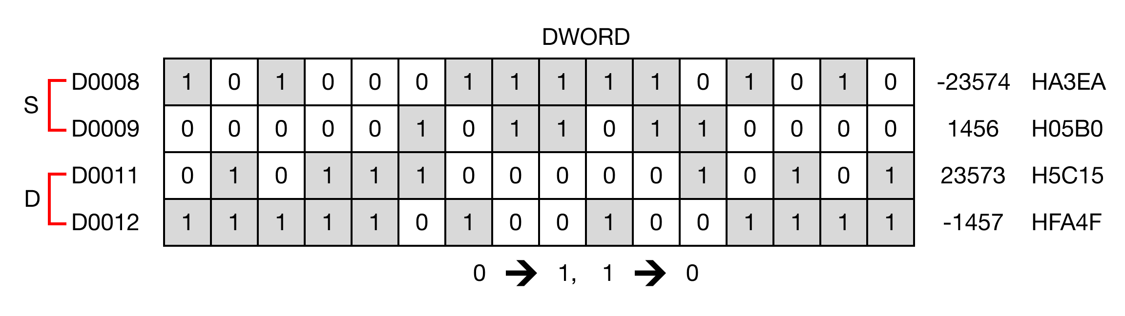 When the contact, M0.0, is powered ON (1), the instruction inverts the bits in the DWORD data register, D8, and saves the result in the data register, D11.