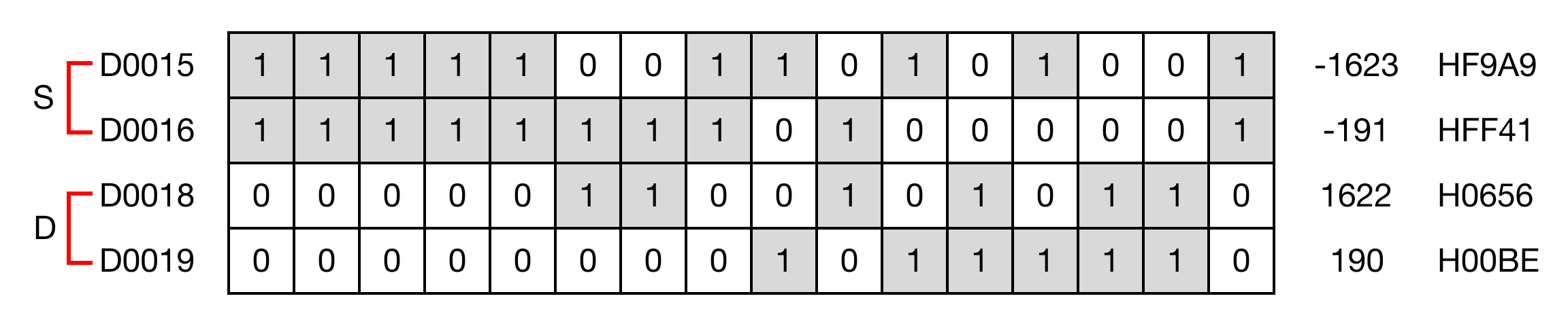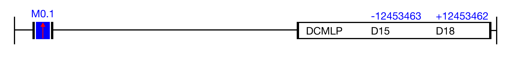 When the contact, M0.1, is powered ON (1), the instruction inverts the bits in the DWORD data register, D15, and saves the result in the data register, D18.