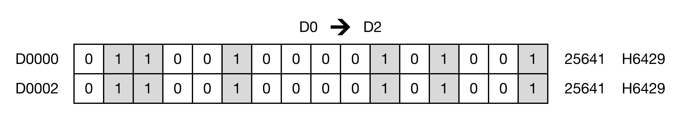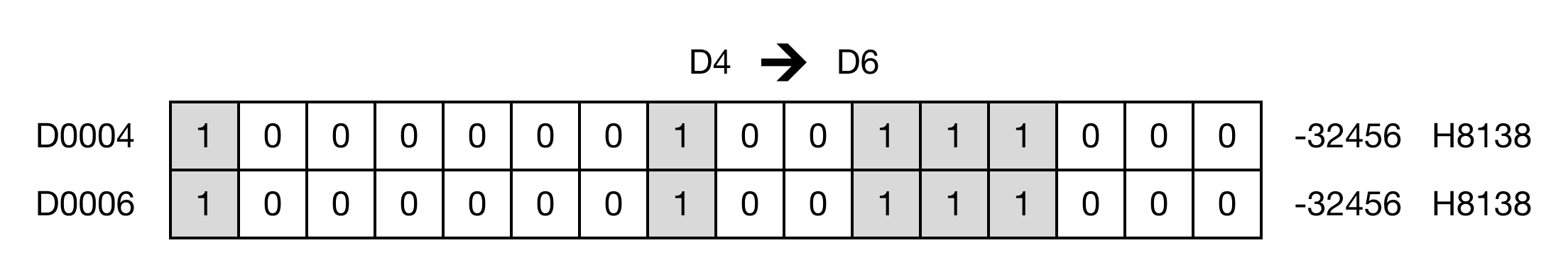 When the contact, M0.1 is ON (1), the instruction copies the value in the WORD data register, D4, into the data register, D6.