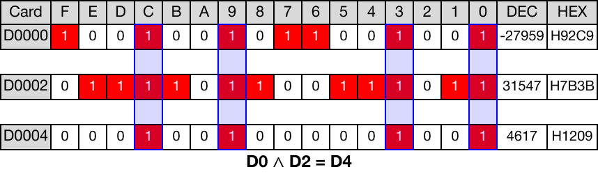 When the contact, M0.0, is powered ON (1), a logical AND operation is performed on the WORD data registers, D0 and D2.