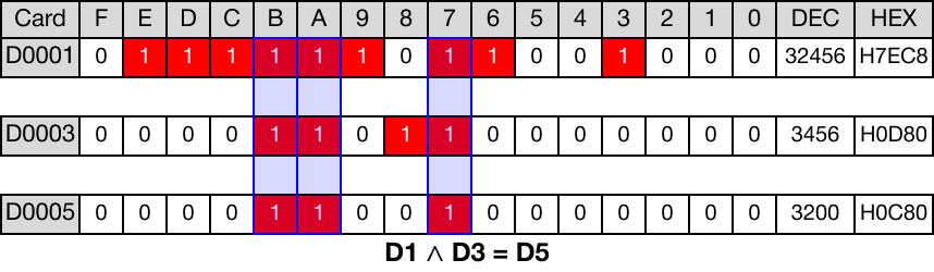 When the contact, M0.1, is powered ON (1), a logical AND operation is performed on the WORD data registers, D1 and D3.