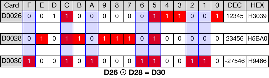 When the contact, M1.0, is powered ON (1), a logical XNOR operation is performed on the WORD data registers, D26 and D28.