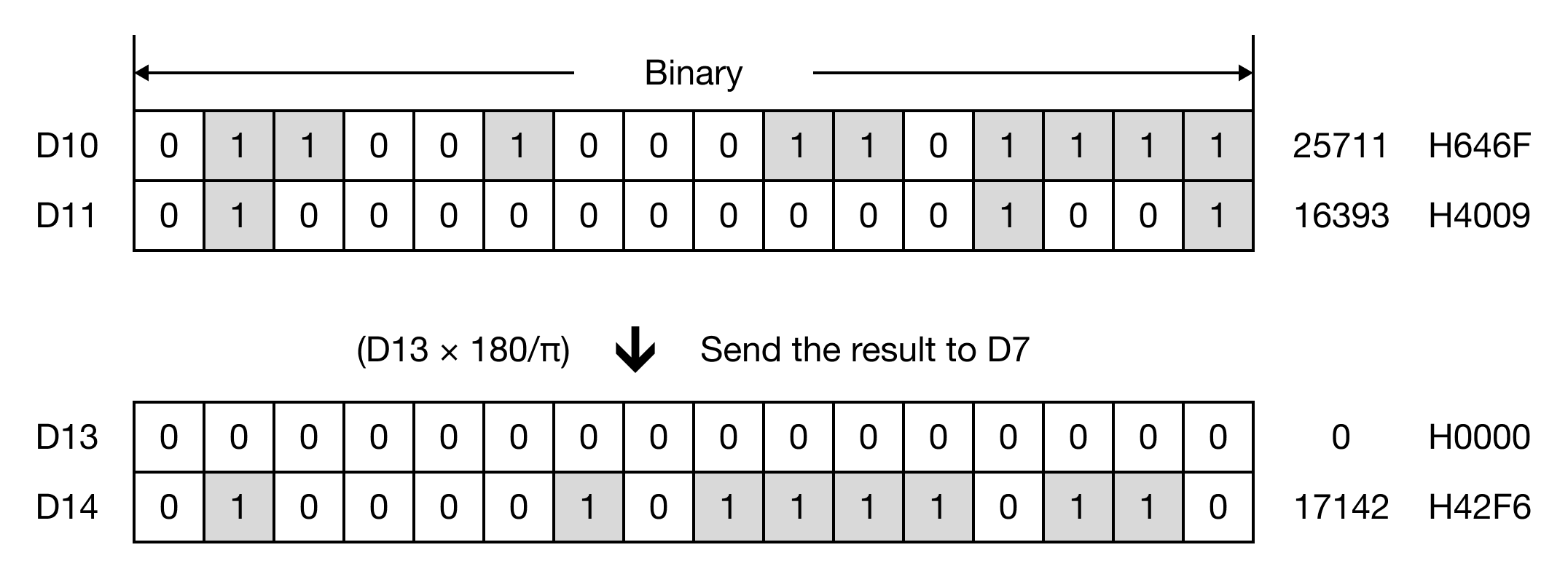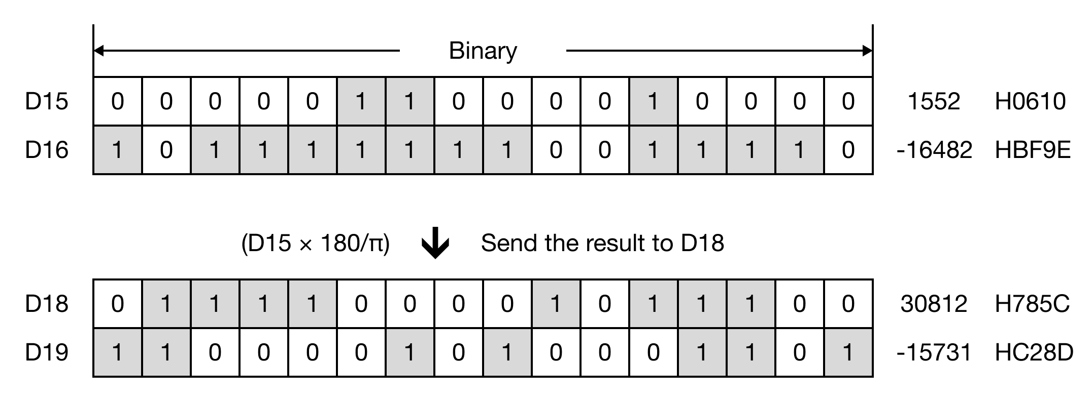 When the contact, M0.2, is ON (1), the instruction converts the degree value, 2.146755, into the resulting radian value, 123.000000.