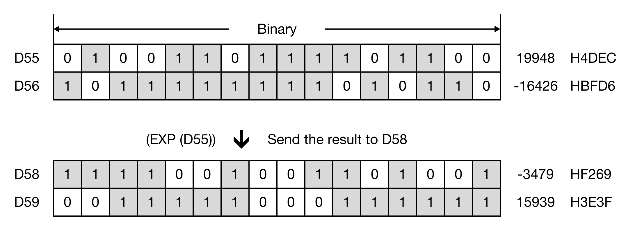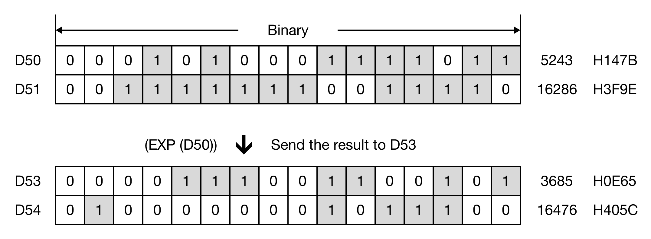 The EXP instruction raises the base constant e, to the exponent WORD value, S, and saves the power in an assigned WORD data register, D.