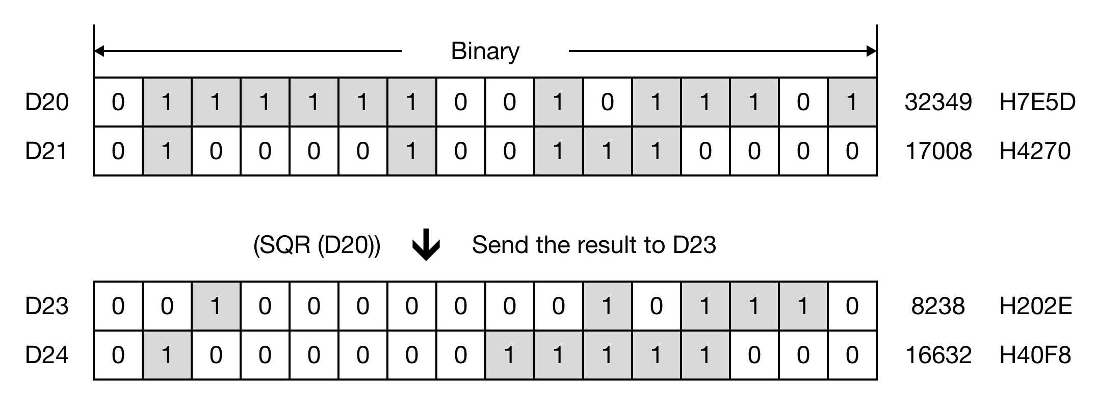 The SQR instruction calculates the square root of the REAL value, S, and saves the result in an assigned REAL data register, D.