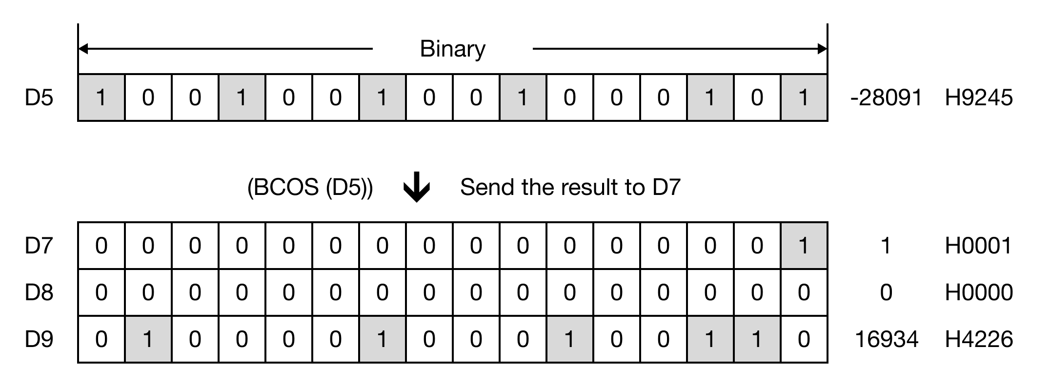 When the contact, M0.2, is ON (1), the instruction executes cos(H9245) and saves the result, H00000001.