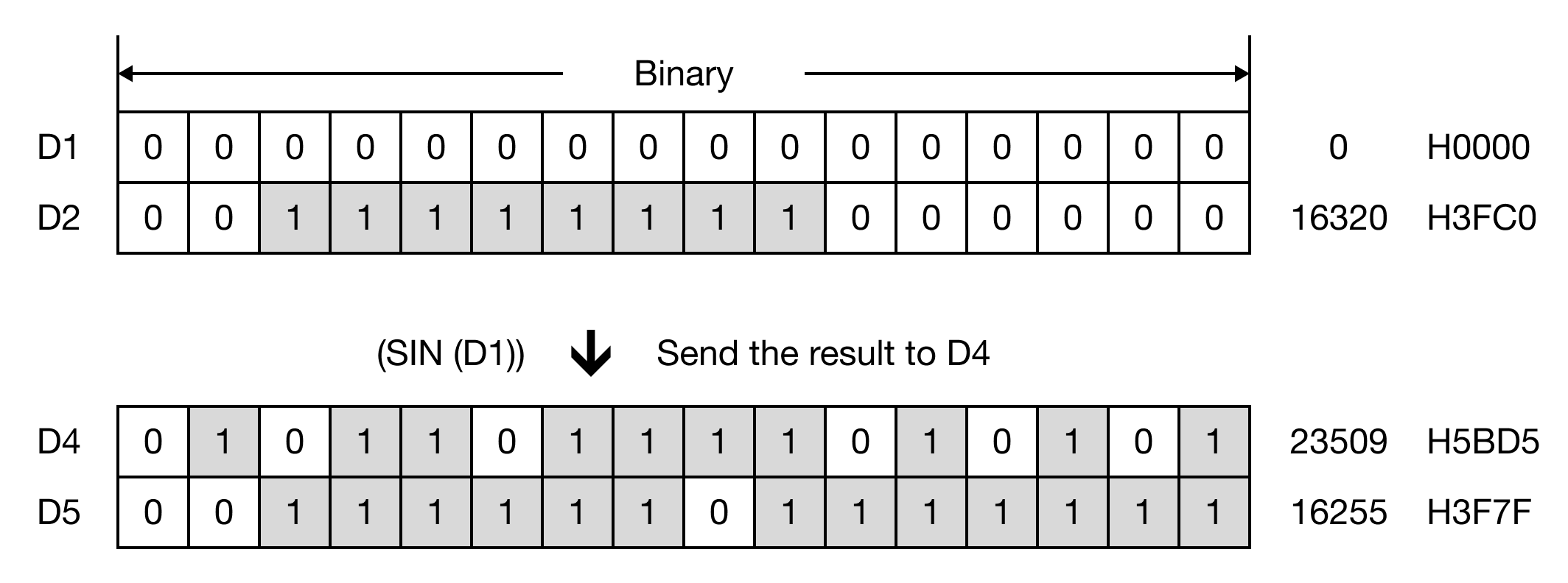 When the contact, M0.0, is ON (1), the instruction executes sin(1.5) and saves the result, 0.997495.