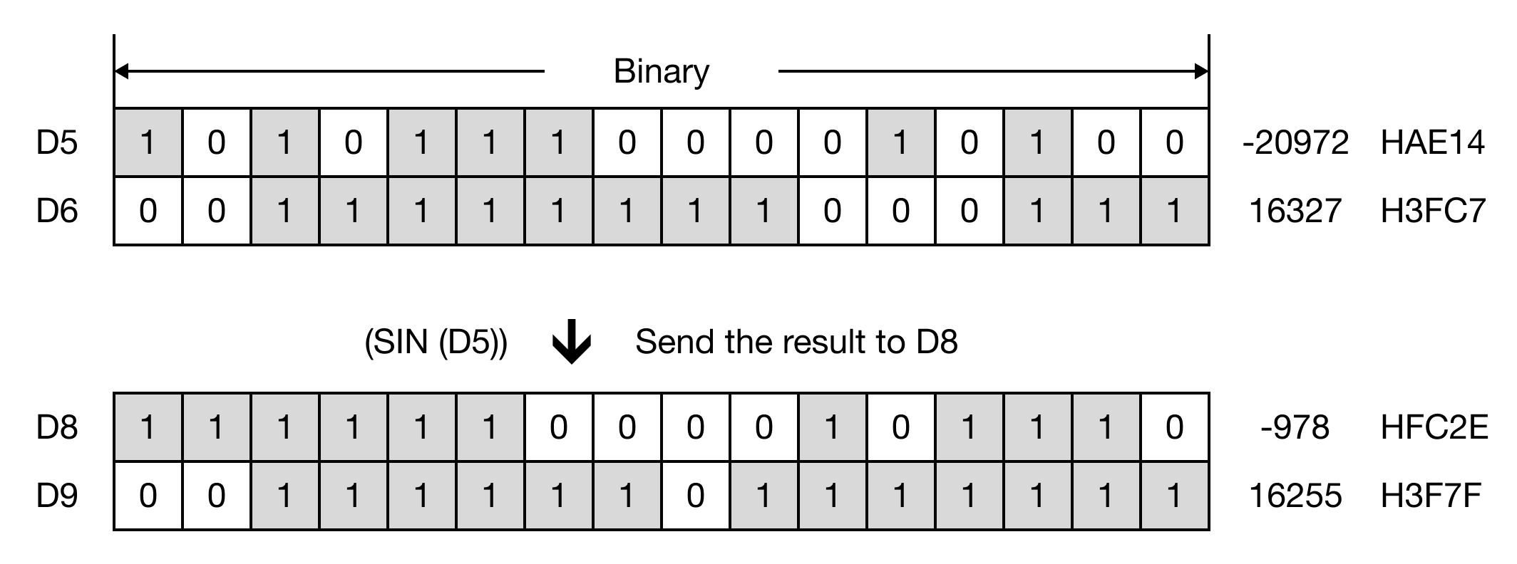 The SIN instruction calculates the sine of the REAL operand, S, and saves the result in an assigned REAL data register, D.