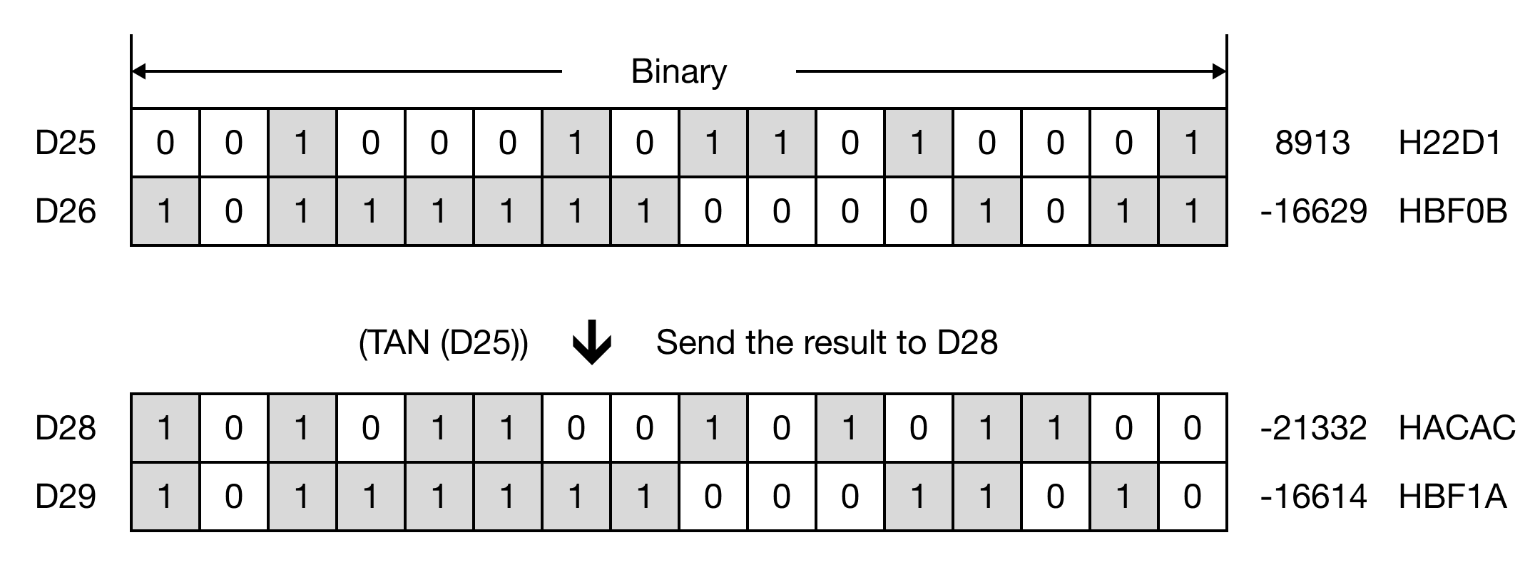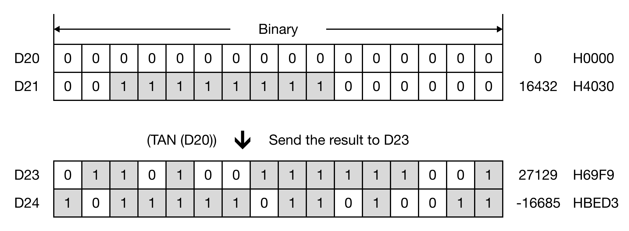 The TAN instruction calculates the tangent of the REAL operand, S, and saves the result in an assigned REAL data register, D.