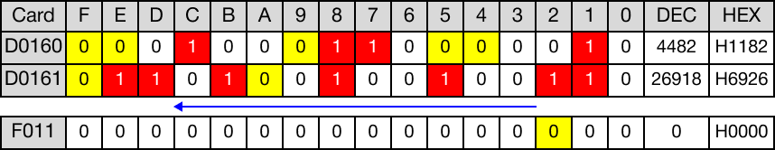 When the contact, M16.0, is powered ON (1), the DWORD data register, D160, rotates 3 bits to the left.