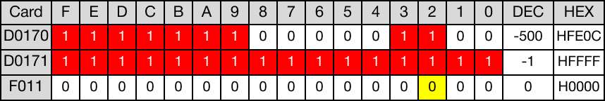 The value of the DWORD data register, D170, changes from -500 to -1,997.