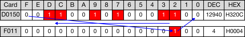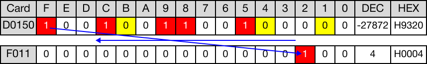 When the instruction is reenergized, the value of the WORD data register, D150, changes from -27,872 to 12,940.