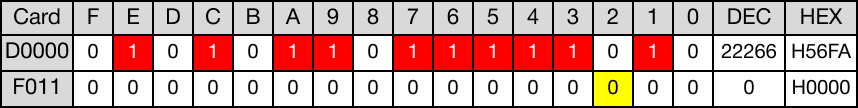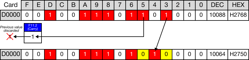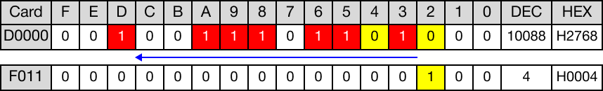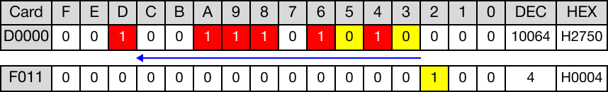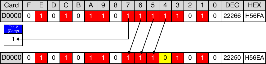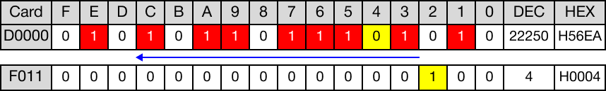 When the contact, M2.1, is powered ON (1), the instructions shifts 4 bits of the WORD data register, D5, 1 bit to the left, starting at the BOOL data register, D5.4.