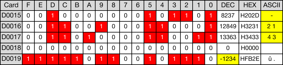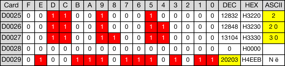 When the contact, M1.0, is powered ON (1), the DABIN instruction converts three ASCII data registers, D15, D16, and D17, into binary.