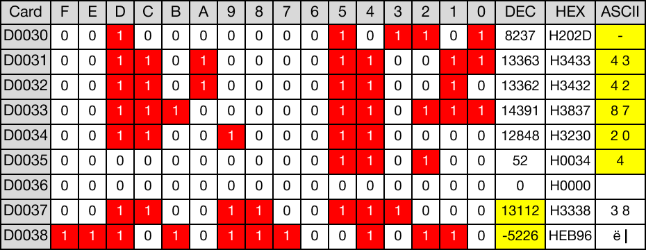 When the contact, M1.0, is powered ON (1), the DDABIN instruction converts six ASCII data registers, D30, D31, D32, D33, D34, and D35, into binary.