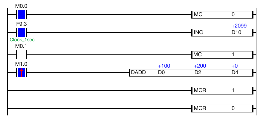 The Master Control area will execute the INC instruction every second if the contact, M0.0, is ON (1).