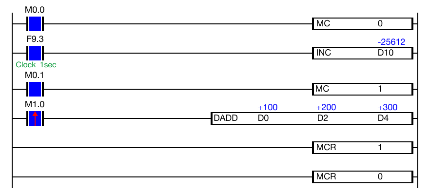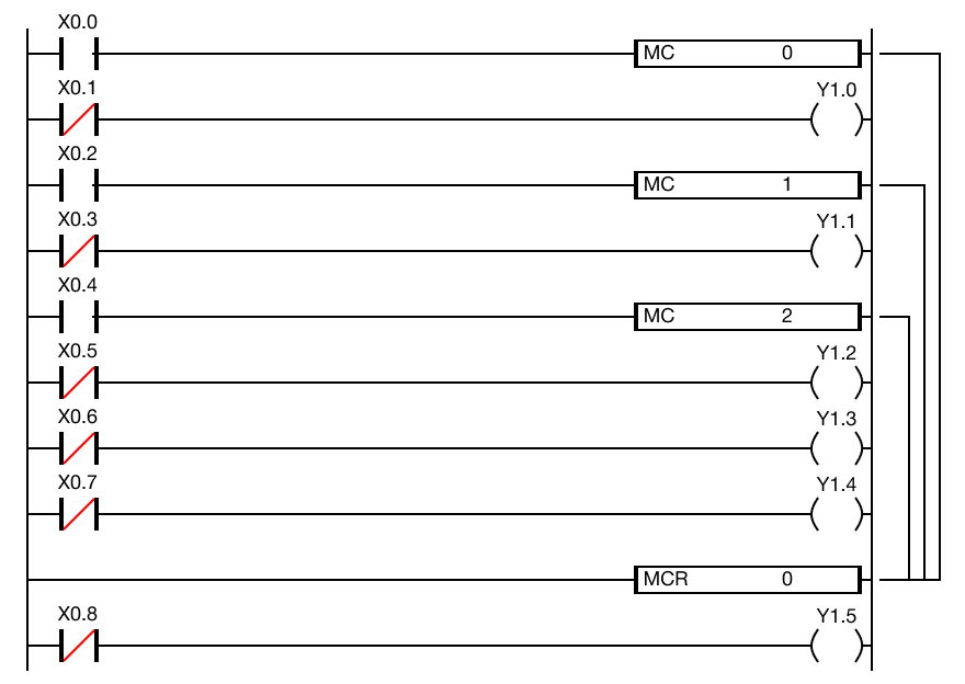 This example shows the lower to higher nesting order for the MC instruction where the MCR instruction terminates with the lowest possible value, 0.