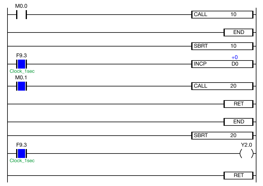When the contacts, M0.0 and M0.1, are powered ON (1), the data register, D0, is increasing every 1 scan by the INCP instruction and the data register, Y2.0, is energizing every 1 second.