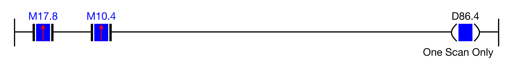 When the rising edge (one-shot) contact, M17.8, is powered ON AND the rising edge (one-shot) contact, M10.4, is powered ON, the coil, D86.4, is energized for only 1 scan.