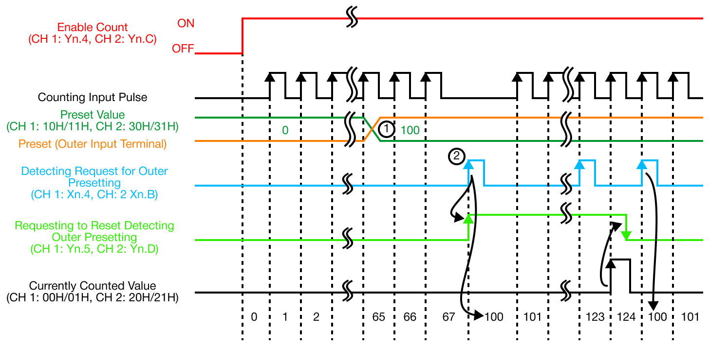 | 2 | At the rising edge of the requesting to preset (Yn.1 or Yn.9), from OFF to ON, the currently-counted value of the buffer memory is set up as the preset value of the buffer memory. The value is preset irrelevantly to the enable counting (Yn.4 or Yn.C). |