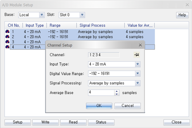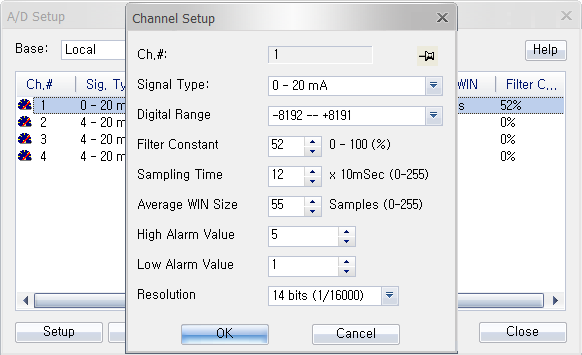 Click Setup to choose the signal type, digital range, filter constant, sampling time, average window size, high alarm, low alarm, and resolution.