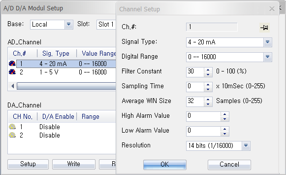 Click Setup to choose the signal type, digital range, filter constant, sampling time, average window size, high alarm, low alarm, and resolution.