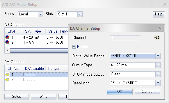 Click Setup to enable/disable the module, or configure the digital value range, STOP mode output, output type, or resolution.