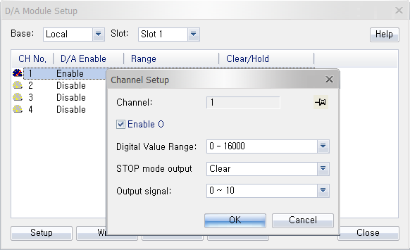 Click Setup to enable/disable the module, or configure the digital value range, STOP mode output, or output signal.