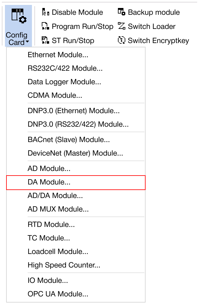 Navigate to Online → Special Module Setup → DA Module or click on the DA module within the Card Properties.
