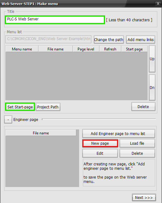 - This is where you can configure the web server name and primary page that will appear in the browser tab in green. To create a new page, select New page.