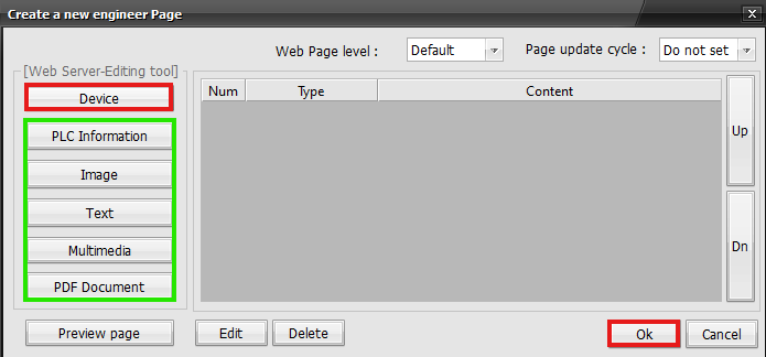 - The information in green is an optional setting to configure for the web server. To add controlled data registers to the web server, select Device.