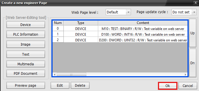 - These are the data register settings. The Device information box specifies the data register to include on the web server. This consists of all allowable data registers: M, X, Y, K, L, F, T, C, S, Z, R, Q, and D. The information in green defines the variable data type, name, read or write, and description.
