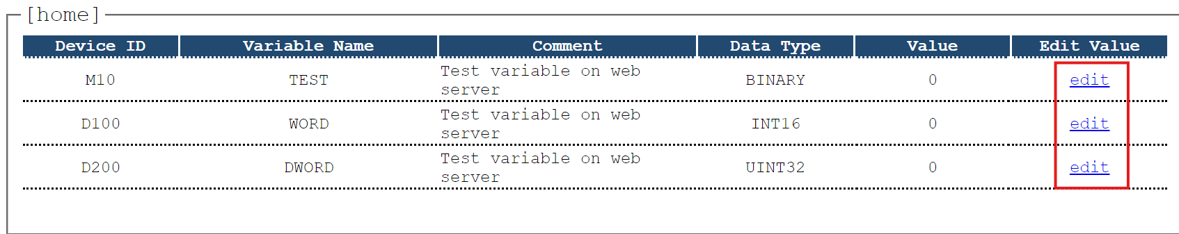 - The web server will redirect to the main page defined in the Web Server Manager. This is where the data registers can be modified. Click edit to modify a data register's value.