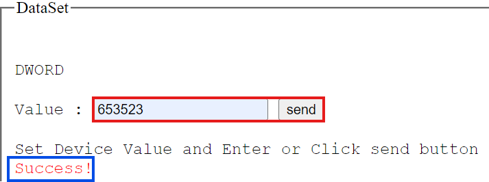 - Enter a value allowed by the data register’s data type. This example uses a DWORD data register. After clicking send, the Success! message will appear in the bottom left.
