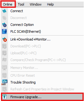 - Connect the CPU to CICON. To do this, navigate to Online and Connect. To change the method of connecting to the PLC-S, navigate to Online and Connect Option. Afterwards, click Connect.