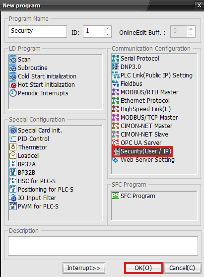 - In the Project Tree, right-click Program and click New Program. Create a new Security(User / IP) program. Click OK.