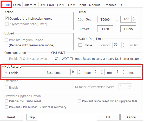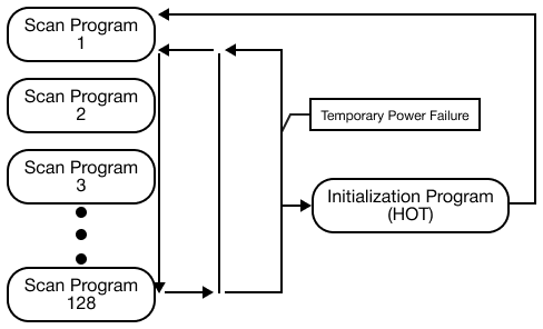 If the power temporarily fails within the setting time and the hot restart option is enabled, the hot start initialization program is executed. This helps keep previous values before the power fails. It also helps to successfully execute the scan program.
