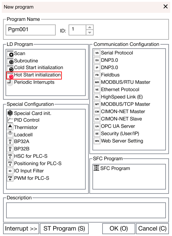 To use the hot start initialization program, enable it in the PLC Parameter window.