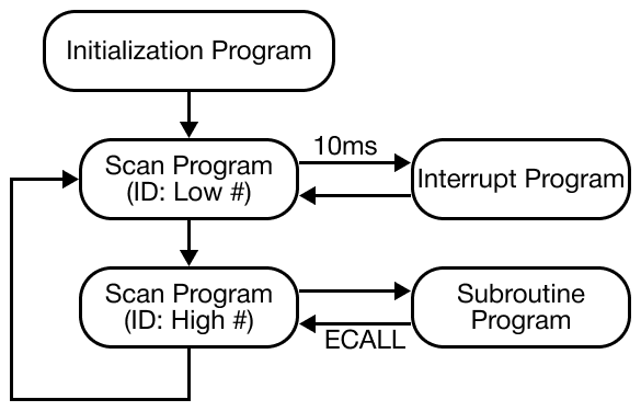 The initialization program operates only during the early stage of PLC operation. The scan program operates repeatedly as long as the PLC is running. Subroutine programs are executed only when called by the ECALL instruction during the scan program.