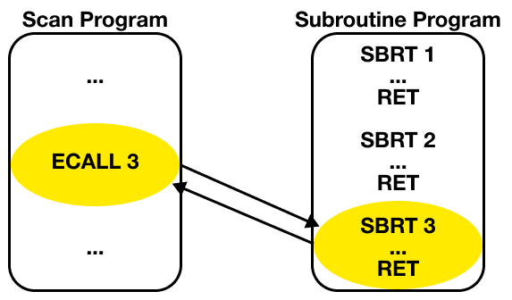 LD ProgramSubroutineOn this pageSubroutine ProgramSubroutine Program The subroutine program is a collection of programs that are called by the ECALL instruction in the scan program. The scan program calls the SBRT n ~ RET instructions in the subroutine program using the ECALL instruction.