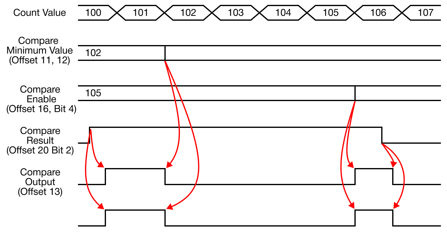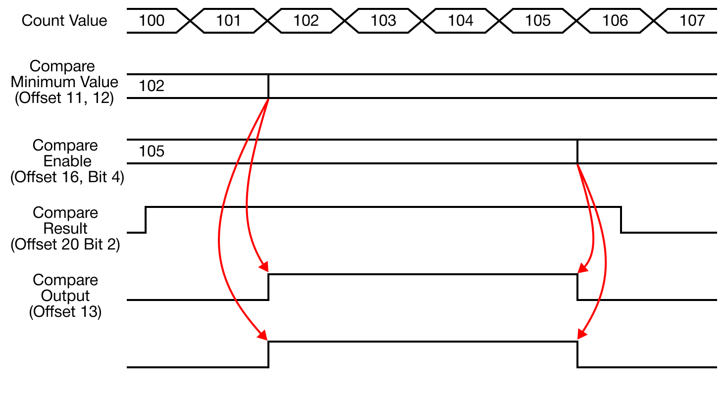 - When the currently-counted value is less than the compare output minimum value, the output is turned ON.