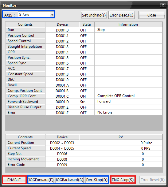 To JOG forward, backward, or stop positioning, left-click JOGForward(F), JOGBackward(B), or Dec Stop(D).