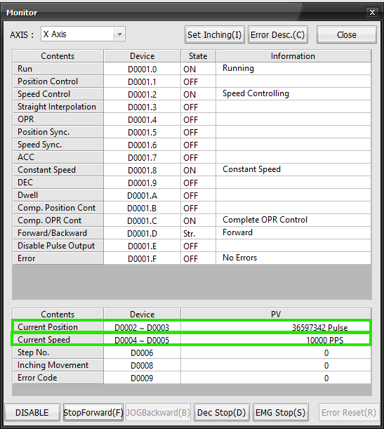 - If the Current Speed is greater than 0 pulses per second, then the positioning operation is active.