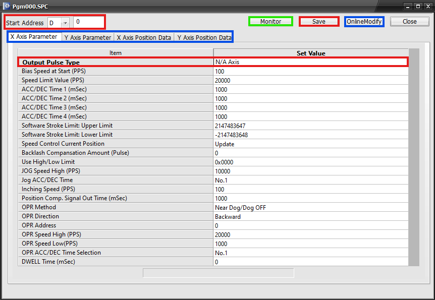 Left-click Save or OnlineModify (if the PLC-S is connected) to save any changes made to the positioning program.